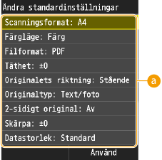 <Meny>  <Scanningsinställningar>  <E-postinställningar>  <Ändra standardinställningar>  Tryck på inställningen  Ändra standardvärdet för valt alternativ <Använd>