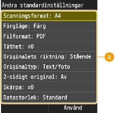 <Meny>  <Scanningsinställningar>  <Filinställningar>  <Ändra standardinställningar>  Tryck på inställningen  Ändra standardvärdet för valt alternativ <Använd>