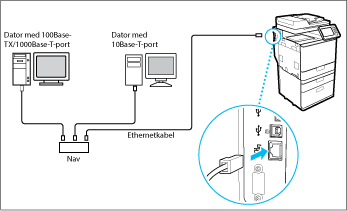Anslut enheten till en dator via en router. Använd en nätverkskabel för att ansluta enheten till routern.