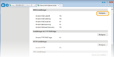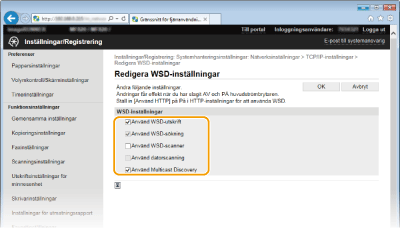 Markera kryssrutan om du vill hämta information om enheten från en dator via WSD. Kryssrutan markeras automatiskt när kryssrutan [Använd WSD-utskrift] är markerad. [Använd WSD-scanner]