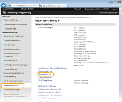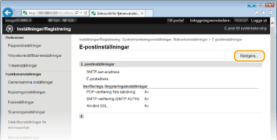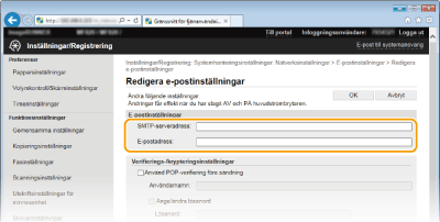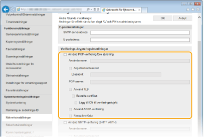 Använd Fjärranvändargränssnittet till att konfigurera detaljerade e-postinställningar, till exempel POP för SMTP-autentisering och TLS-kryptering. Mer information om nödvändig inställningar får du av Internettjänstleverantören eller nätverksadministratören.