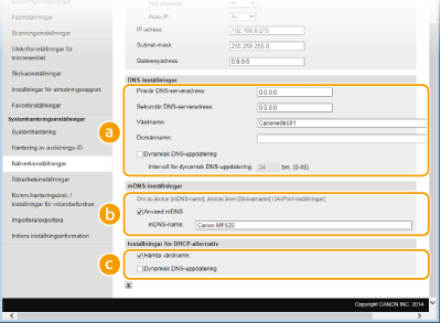 Markera kryssrutan för att dynamiskt uppdatera DNS-posterna när enhetens IP-adress ändras. Om du anger ett intervall mellan uppdateringar anger du tiden i timmar i textrutan [Intervall för dynamisk DNS-uppdatering]. [mDNS-inställningar][Använd mDNS]