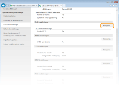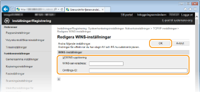 Om IP-adressen för WINS-servern hämtas från en DHCP-server, åsidosätter den hämtade IP-adressen den IP-adress som anges i textrutan [WINS-serveradress].