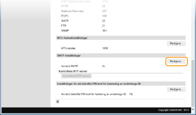 [Nätverksinställningar] [TCP/IP-inställningar] och klicka på [Kontrollera NTP-server] i [SNTP-inställningar]. Om en korrekt anslutning har upprättats visas resultatet enligt nedan. Den här åtgärden justerar inte systemklockan.![]() |