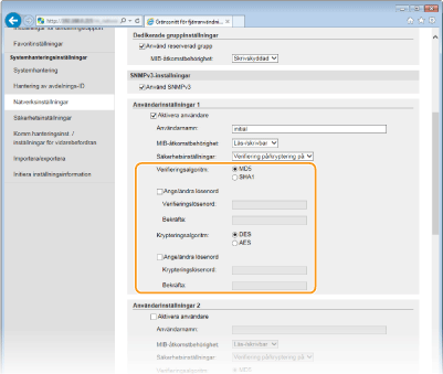 Markera kryssrutan [Aktivera användare] och ange inställningar för [Användarnamn], [MIB-åtkomstbehörighet] och [Säkerhetsinställningar].