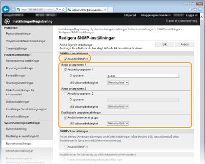 Markera kryssrutan [Använd gruppnamn 1] eller [Använd gruppnamn 2], ange gruppnamnet i textrutan [Gruppnamn] och ange [MIB-åtkomstbehörighet].