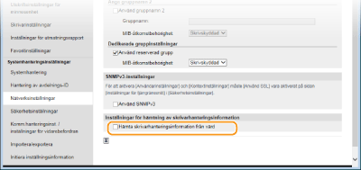 Inaktivera SNMPv1Vissa funktioner i enheten kan inte användas, till exempel att hämta enhetsinformation via skrivardrivrutinen.