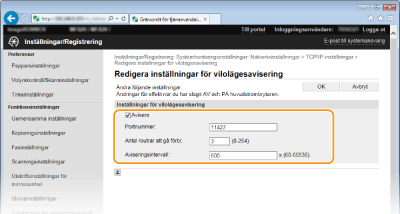 Markera kryssrutan för att meddela ett enhetshanteringsprogram om enhetens strömstatus. Om [Avisera] markeras kan du förvänta dig att enheten undviker onödig kommunikation under viloläge och därmed minskar den totala strömförbrukningen. [Portnummer]