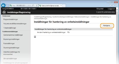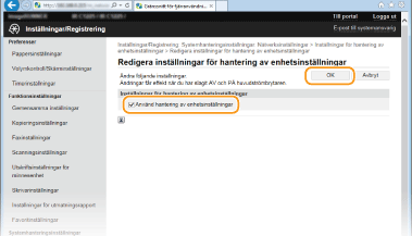 Om du vill aktivera reserverade portinställningar och SNMP-inställning (antingen SNMPv1 eller SNMPv3) för att kunna kommunicera med ett iW Management Console plugin-program. Välj [Läs-/skrivbar] (behörighet till) för [MIB-åtkomstbehörighet] i SNMP-inställning (antingen SNMPv1 eller SNMPv3). Inställn. för reserverad port Övervaka och styra enheten med SNMP