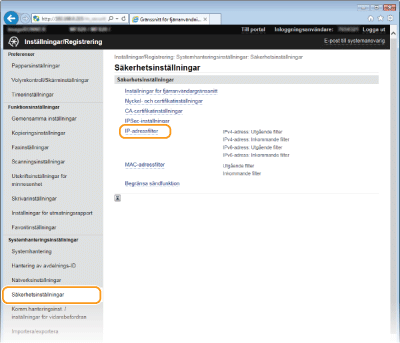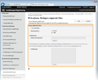 Om IP-adresser anges felaktigt kanske du inte kan använda enheten från Fjärranvändargränssnittet och då måste du ställa in <IPv4-adressfilter> eller <IPv6-adressfilter> på <Av>. IPv4-adressfilter IPv6-adressfilter