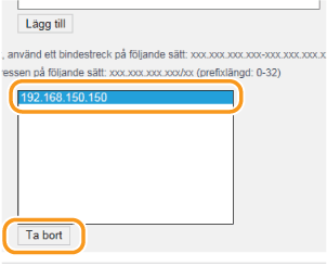 Ta bort en IP-adress från undantag Välj en IP-adress och klicka på [Ta bort].