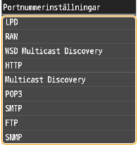 Portar fungerar som slutpunkter vid kommunikation med andra enheter. Vanliga portnummer används för de flesta protokoll, men enheter som använder dessa portnummer blir sårbara för angrepp eftersom dessa portnummer är välkända. Din nätverksadministratör kan ändra portnumren för att öka säkerheten. När ett portnummer har ändrats måste det nya numret delas med kommunikationsenheterna, till exempel datorer och servrar. Ange portnummerinställningar beroende på nätverksmiljön.