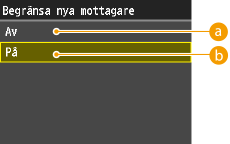 Du kan, genom att begränsa faxnummer som kan anges vid sändning av dokument till dem som redan registrerats i adressboken, till dem som tidigare använts eller till dem som är sökbara från LDAP-servrar, minska möjligheten att ange felaktiga mottagare och förhindra att användare läcker information. När den här funktionen är aktiverad kan användare inte ange mottagare med siffertangenterna, lägga till nya poster i adressboken eller redigera befintliga adressboksposter.