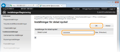 Ange upp till 24 alfanumeriska tecken för den på förhand delade nyckeln och klicka sedan på [OK].