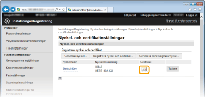 [Nyckel- och certifikatinställningar] (för nyckelpar) eller på [CA-certifikatinställningar] (för CA-certifikat).