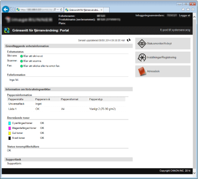 Du har tillgång till alla åtgärder och inställningar i Fjärranvändargränssnittet. Ange lämpligt ID i [Systemansvarig-ID] och PIN-kod i [Systemansvarig-PIN-kod] (