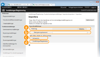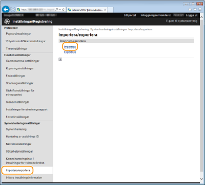 Du kan spara inställningsdata för menyalternativ på datorn eller registrera sparade data i enheten. Exporterade data kan importeras. Om du använder samma modell kan andra enheter importera data som exporterats från den här enheten och tvärtom. Dessa funktioner kan bara utföras om du har loggat in i systemhanteringsläge.
