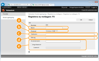 Om du vill använda en filserver anger du IP-adressen till FTP-serven (upp till 120 tecken) (exempel: \\192.168.2.100\share).