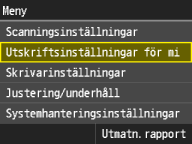 Alla minnesmedieinställningar för utskrift visas med korta beskrivningar. Standardinställningarna markeras med ett kors (