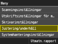 Alla inställningar för justering och underhåll visas med korta beskrivningar. Standardinställningarna markeras med ett kors (