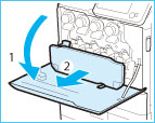 Placera den uttagna behållaren på en jämn yta. Om behållaren lutas för mycket kan toner spillas ut.