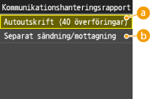 Du kan kontrollera fax- och e-postloggar över sända och mottagna dokument genom att skriva ut en kommunikationshanteringsrapport. Rapporten kan skrivas ut automatiskt efter var fyrtionde överföring eller också kan du skriva ut den manuellt.