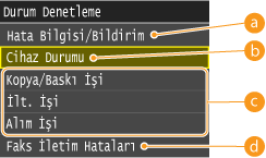 tuşuna bastığınızda, yazdırılmakta, gönderilmekte veya alınmakta olan belgelerin durumunun yanı sıra, toner düzeyleri veya makinenin IP adresi gibi ağ ayarı bilgilerinin dahil olduğu makine durumunu da denetlemenize olanak sağlayan bir ekran görüntülenir.