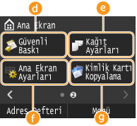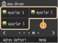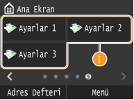<Sık Kullanılan Kopya Ayarları> <Sık Kullanılan Faks Ayarları> (imageRUNNER C1225iF) <Sık Kullanılan Tarama Ayarları>Kopyalama, Faks ve Tarama işlevlerinin her biri için sıkça kullanılan ayarları görüntüler. <Kimlik Kartı Kopyalama>, <Ayarlar 1> değerine önceden kaydedilmiştir. Sık Kullanılan Kopyalama Ayarlarını Kaydetme