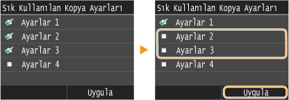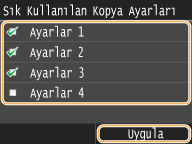 Giriş Ekranında görüntülenmelerini iptal etmek için tüm ayarlara yönelik onay kutusunu temizleyin ve <Uygula> öğesine dokunun.
