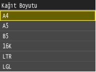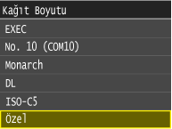 Kağıt yüklendiğinde yukarıda gösterilen ekran görüntülenmezseÇok amaçlı tepsiye her zaman aynı kağıdı yüklerseniz, varsayılan ayar olarak kağıt boyutunu ve türünü kaydederek kağıt ayarı işlemlerini atlayabilirsiniz. Ancak varsayılan ayar kaydedildiğinde, yukarıda gösterilen ekran görüntülenmez. Ekranı görüntülemek üzere <Varsayılan Ayarları Kaydet> için <Kapalı> seçeneğini belirleyin (Çok Amaçlı Tepsi İçin Varsayılan Kağıt Ayarlarını Kaydetme).