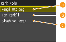 <Rengi Oto Seç> modu seçiliyse makine orijinal kopyanın renkli mi siyah beyaz mı olduğunu otomatik olarak anlar. Renkli orijinal kopyalar Tam Renkli modunda, siyah beyaz orijinal kopyalar ise Siyah Beyaz modunda kopyalanır.