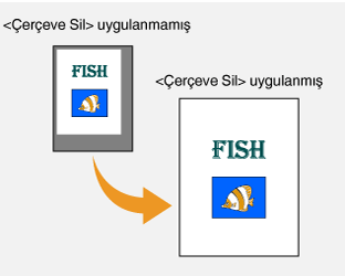 Çıktı kağıdı boyutundan daha küçük belgeleri kopyalarken kopyalanan görüntünün kenarlarında çerçeve çizgileri görünebilir. Kalın bir kitaptan birbirine bakan sayfaların kopyası alınırken koyu renkli kenarlıklar görünebilir. <Çerçeve Sil>, çerçeve çizgilerini ve koyu kenarlıkları silmenize olanak sağlar.