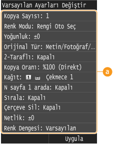 tuşuna bastığınızda görüntülenen ayarlardır. Bu varsayılan ayarları, sıkça gerçekleştirdiğiniz işlemlerle eşleşecek şekilde değiştirirseniz, kopya yaptığınız her seferde aynı ayarları yapılandırma gereksinimini ortadan kaldırabilirsiniz.