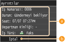 Belge gönderme sayısı, ayarlar ve diğer ayrıntılar görüntülenir. Göndermeden yalnızca ayrıntıları denetlemek istiyorsanız faks ana ekranına dönmek için