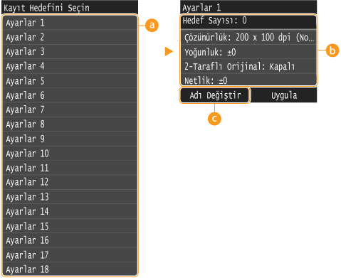 Fakslama ayarları için en fazla dört sık kullanılan birleşim kaydedebilirsiniz. İhtiyacınız olduğunda kayıtlı bir ayar birleşimini seçerek her faks gönderdiğinizde aynı ayarları yapılandırma gereksinimini ortadan kaldırabilirsiniz, örneğin alıcı sayısını sıklıkla 5 olarak ayarlıyorsanız 2 taraflı orijinal kopyayı ayarlayın ve fakslama yaparken keskinliği artırın. Ayar birleşimlerini <Ayarlar 1> - <Ayarlar 18> olarak kaydedebilirsiniz.