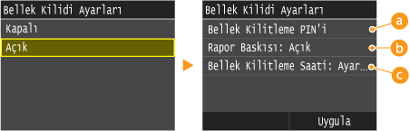 Alınan belgeleri bellekte saklamak için <Bellek Kilidi Ayarları> öğesini <Açık> olarak ayarlayın. Özelliğin kilidinin kaldırılması için parola gerektiren bir güvenlik ayarı ve alınan belgelerin gün içinde bellekte saklanacağı süreyi belirten ayar gibi isteğe bağlı ayarları da belirtebilirsiniz.
