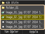 USB bellek aygıtında saklanan resim dosyalarının (yalnızca JPEG) küçük resimlerini yazdırabilirsiniz. Görüntüleri küçük resimler halinde yazdırmak için ekranda <Dizin Baskı> öğesine dokunun ve sonraki adıma ilerleyin.