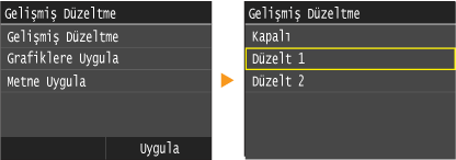 <Grafiklere Uygula> ve <Metne Uygula> yalnızca Gelişmiş Yumuşatma için <Düzelt 1> veya <Düzelt 2> seçeneği seçildiğinde seçilebilir.