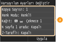 tuşuna bastığınızda görüntülenen ayarlardır. Bu varsayılan ayarları, sıkça gerçekleştirdiğiniz işlemlerle eşleşecek şekilde değiştirirseniz, yazdırma yaptığınız her seferde aynı ayarları belirtme gereksinimini ortadan kaldırabilirsiniz.