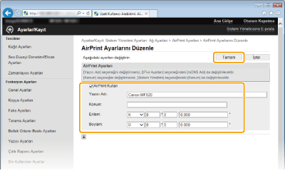 Apple aygıtınızı çalıştırırken bu makineyi tanımlamanıza yardımcı olması için ad ve kurulum konumu bilgilerini girin. Birden fazla AirPrint yazıcınız varsa bu bilgiler kullanışlıdır.