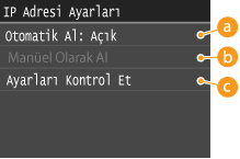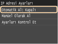 ![]() ![]() IP adresi atamak için DHCP kullanmak istemiyorsanız <Kapalı> seçeneğini seçin. Kullanılabilir olmadığında <DHCP> hizmetini seçerseniz, makine bu hizmete ilişkin ağ arayarak zaman ve iletişim kaynaklarını harcar. |