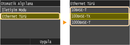 Ethernet, yerel ağ (LAN) üzerinde veri iletişimi standardıdır. İletişim modunu (yarı dupleks/tam dupleks) ve Ethernet türünü (10BASE-T/100BASE-TX/1000BASE-T) ayarlayabilirsiniz. Genellikle makine, varsayılanlar değiştirilmeden kullanılabilir (Ethernet Sürücüsü Ayarları), ancak bu ayarları ağ ortamınıza uyacak şekilde değiştirebilirsiniz.