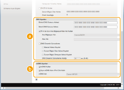 Makinenin IP adresi her değiştiğinde DNS kayıtlarını dinamik olarak güncellemek için onay kutusunu işaretleyin. DNS sunucusuna kaydetmek istediğiniz adres türlerini belirtmek için, [Manüel Adresi Kaydet], [Durum Bilgisi Olan Adresi Kydet] veya [Durum Bilgisi Olmyn Adrsi Kydet] onay kutusunu seçin. Güncellemeler arasındaki aralığı belirtmek için [DNS Dinamik Güncelleme Aralığı] metin kutusuna zamanı saat cinsinden girin. [mDNS Ayarları][mDNS Kullan]