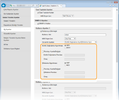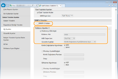SNMP'nin her iki sürümü de etkinleştirilirse, SNMPv1'deki MIB erişim izninin [Salt Okunur] olarak ayarlanması önerilir. MIB erişim izni, SNMPv1'de ve SNMPv3'te bağımsız olarak (ve SNMPv3'teki her kullanıcı için) ayarlanabilir. SNMPv1'de [Oku/Yaz] (tam erişim izni) seçildiğinde, makine ayarlarının çoğu SNMPv1 ile denetlenebildiğinden, SNMPv3'ü nitelendiren sağlam güvenlik özellikleri olumsuz etkilenir.