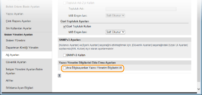 SNMPv1'i Devre Dışı BırakmaYazıcı sürücüsü üzerinden makine bilgilerinin elde edilmesi gibi bazı makine işlevleri kullanılamaz duruma gelebilir.