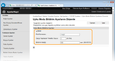 Aygıt yönetimi yazılımına makinenin güç durumunu bildirmek için onay kutusunu seçin. [Bildir] seçildiğinde, makinenin uyku modundayken gereksiz iletişimi önlemesini ve toplam güç tüketiminin azaltılmasını bekleyebilirsiniz. [Port Numarası]