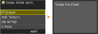[Sayfa Sayısı] için üst sınırı girin. [Taramayı Kısıtla] onay kutusu işaretlenmişse, belgelerin USB bellek aygıtlarına, e-postalara, paylaşılan klasörlere ve dosya sunucularına taranması devre dışı bırakılır. Belgelerin bilgisayarlara <Bilgisayar> ve <Uzak Tarayıcı> aracılığıyla taranmasını da devre dışı bırakabilirsiniz. Ancak, belgelerin bilgisayarlara taranmasını yalnızca tüm kullanıcılar için devre dışı bırakabilirsiniz (Departman Kimliği Bilinmediğinde İşleri Engelleme).