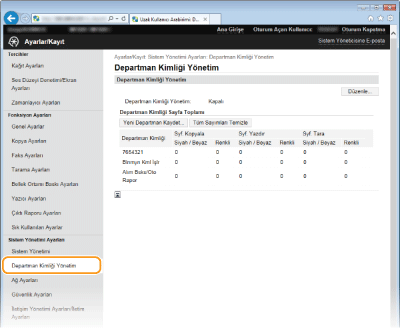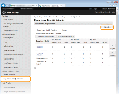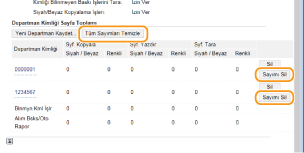 Sayıları sıfırlamak istiyorsanız, [Departman Kimliği] altındaki ilgili metin bağlantısını tıklatın ve ardından [Sayımı Sil]