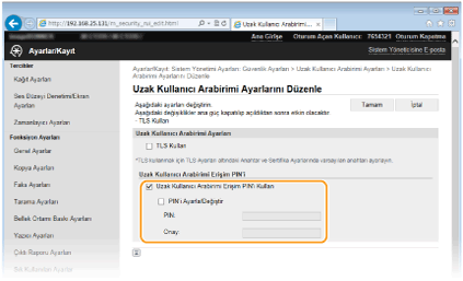 <Sistem Yönetimi Ayarları> <Uzak Kullanıcı Arabirimi Ayarları> <Uzak Kullanıcı Arabirimi Erişim Güvenlik Ayarları> <Açık> PIN'i Girin Uygula PIN'i Girin (Onaylayın) Uygula.Uzak Kullanıcı Arabirimi ayarları başlatılırsaUzak Kullanıcı Arabirimi PIN'i de başlatılır. Başlatma sonrasında PIN'i sıfırlayın. Menüyü Başlangıç Durumuna Getirme