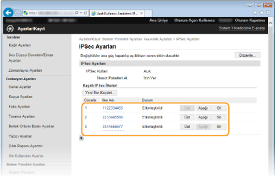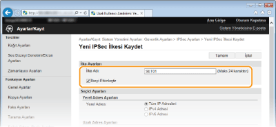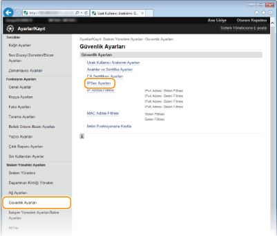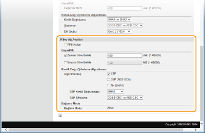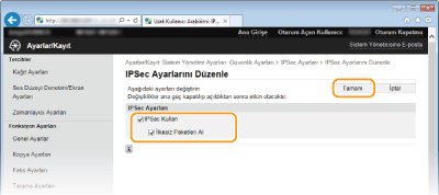 IPSec iletişimini <Menü> öğesinden etkinleştirebilir veya devre dışı bırakabilirsiniz. IPSec Kullan